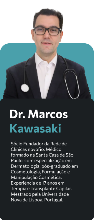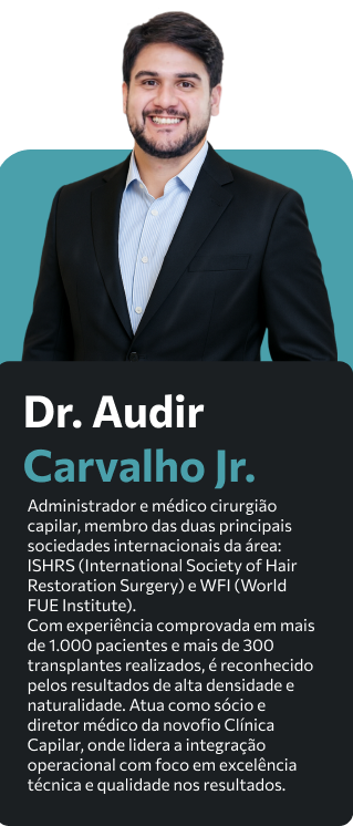 A novofio Clínica Capilar nasce da combinação de quatro grandes forças: a excelência médica do Dr. Marcos Kawasaki e do Dr. Audir Carvalho Jr. em transplantes e terapias capilares, a visão estratégica e experiência de mais de 20 anos de José Carlos Semenzato no mercado de franchising, e o know-how de Paulo Morais, cofundador da Espaçolaser e referência em expansão de redes de saúde e estética. Dr. Audir é médico cirurgião capilar e diretor médico da novofio, com experiência em mais de 1.000 pacientes e mais de 300 transplantes realizados. Membro das principais sociedades de cirurgia capilar do mundo, ISHRS, WFI e SBRCC, atua com foco em resultados naturais e excelência técnica.